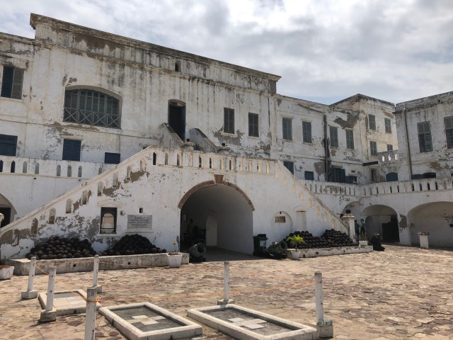 A picture of the courtyard. You’ll notice that the design is different than Elmina castle. The concept is similar though where slaves stayed in the bottom and the governors would reside at the top. The graves in the bottom of the picture are from the governors of the castle.